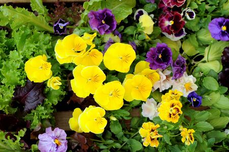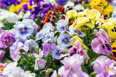 flower bed with colorful pansies in the springtime, closeup, nature background with copy space