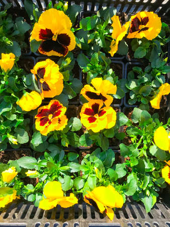 Gardening, nature concept. Closeup of beautiful little yellow flowers, pansies in flowerbed