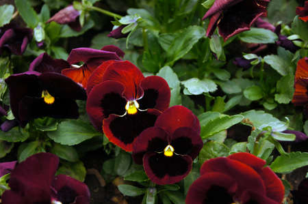Beautiful red pansy flowers in the garden close-up.