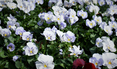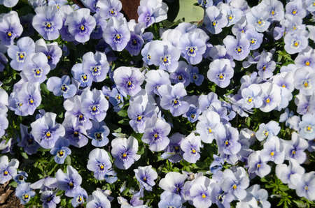 Flowerbed of blue tricolor violas in the spring park