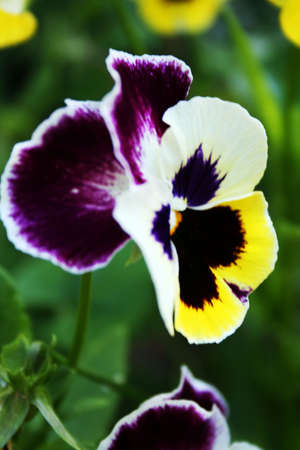 Multicolored pansy flower plant natural background, summer time. Close up