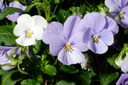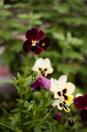 Close up Viola flowers blooming in the garden with a blurred background in spring. selective focus