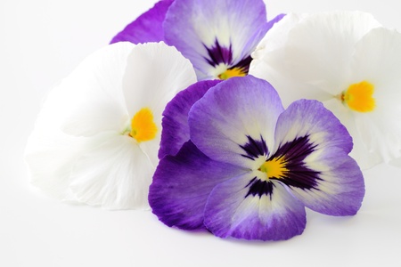 Macro shot of white and purple pansies.