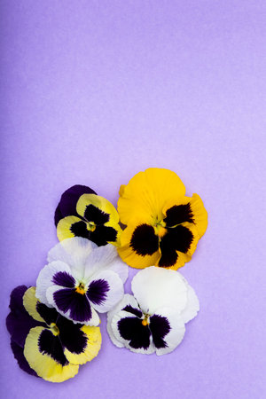 Colorful pansies in yellow white and purple are arranged artistically on a soft purple background showing their delicate petals and striking patterns. This floral display adds a cheerful touch.