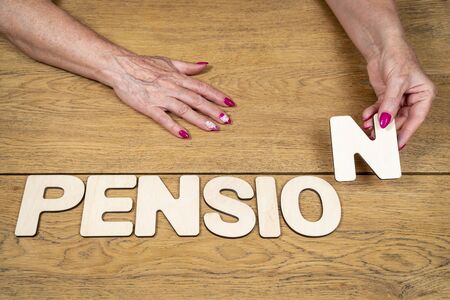 Wooden cubes with letters on the table in the office. Text PENSION. Financial concept