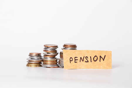 Stacks of coins and paper with the word Pension on a white background, business and finance