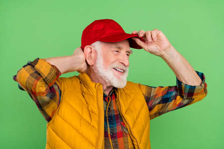 Photo of funky pretty senior gentleman wear yellow vest arms red headwear looking empty space smiling isolated green color background