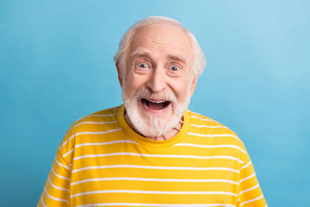 Portrait of excited funky granddad hands touch glasses open mouth unbelievable isolated on cyan color background