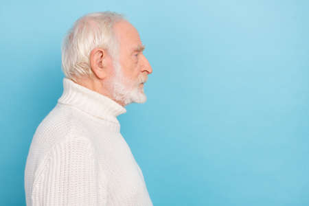 Profile photo of serious aged man look promo wear white jumper isolated on blue color background