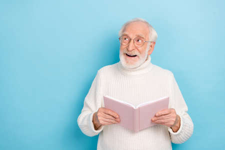 Photo of impressed aged beard man read book look promo wear spectacles pullover isolated on blue color background