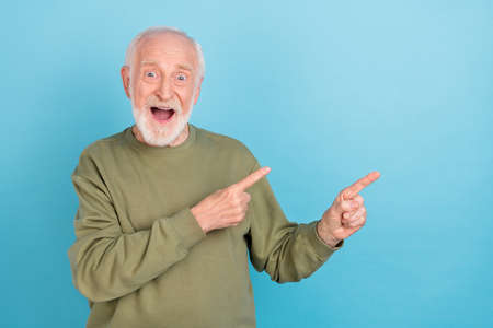 Portrait of attractive cheerful trendy amazed grey-haired man showing copy space ad offer isolated over bright blue color background