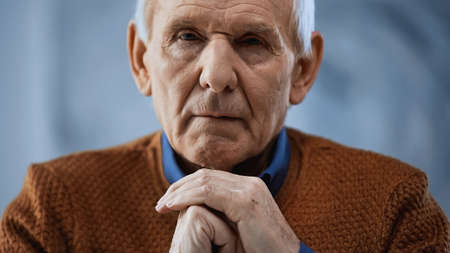 portrait of elderly man with clenched hands near face on gray background