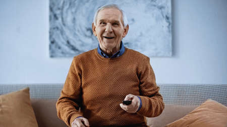 happy senior man sitting on sofa with tv remote controller and looking at camera at home