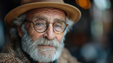 Portrait of an elderly man with glasses and a hat looking at the camera. Close-up of a proud mature man's face.