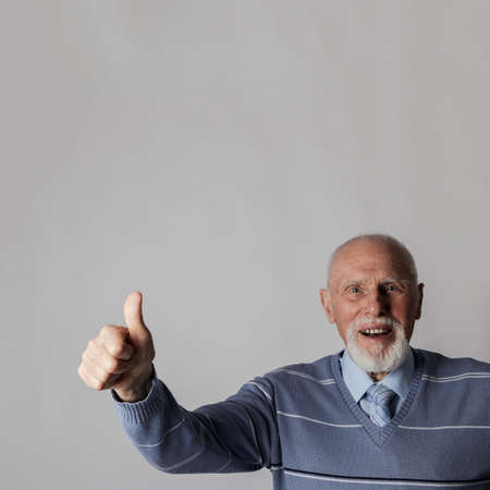 Old man is showing thumb up. Success, happiness and good health.