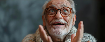 Grey hair surprised man with hands in air look up