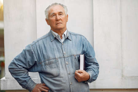 Elegant old man standing on gray background with a book