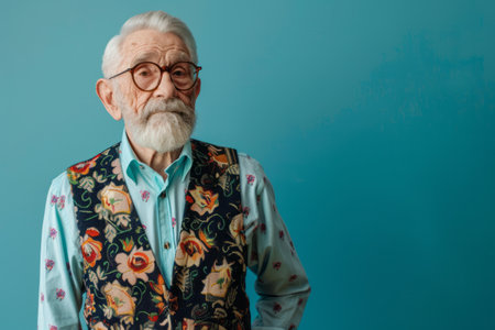 Fashionable stylish modern senior man in a shirt and vest against a blue wall