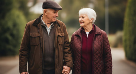 Senior active caucasian couple holding hands looks happy in the park in the afternoon