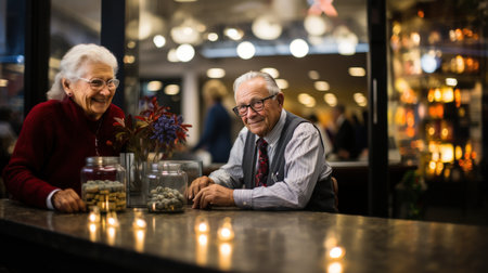 An elderly couple joyfully discusses their upcoming travel plans over coffee in a trendy caf