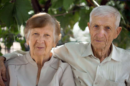 Very old grandma and grandpa cuddling on couch. Love in old age. Wife puts her head on husbands shoulder. Elderly people.