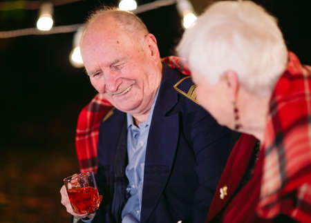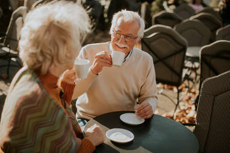 Healthy senior couple drinking coffee in the outdoor cafe on a sunny autumn day