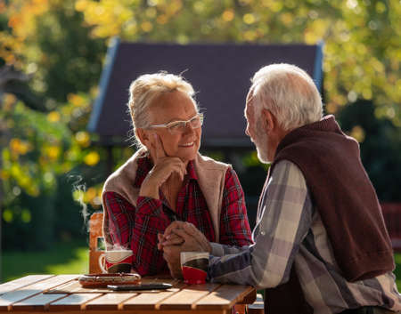 Romantic senior couple sitting in garden at table drinking coffee and talking