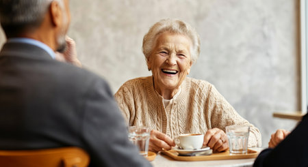 Senior woman, dressed in a knitted sweater, is laughing with friends over coffee at a cafe, creating a joyful and friendly ambiance filled with warmth, AI generated