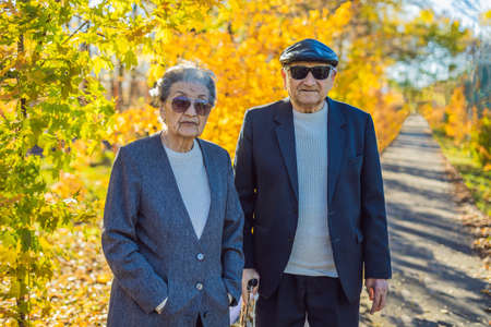 Pensioners in sunglasses in the autumn forest. Pensioners like gangsters.