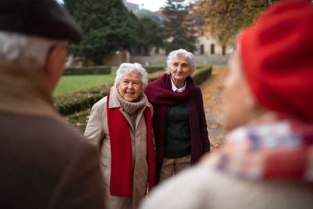 Group of happy senior friends on walk outdoors in town park in autumn, talking and laughing.