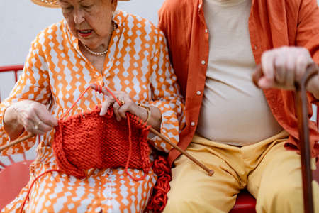 Senior woman sitting in the garden on the bench with his husband and knitting red scarf.