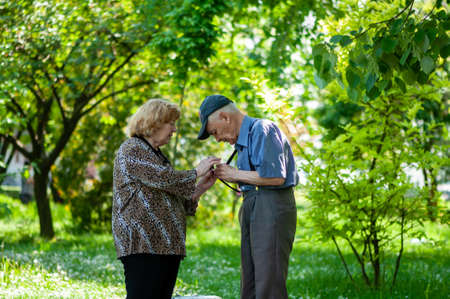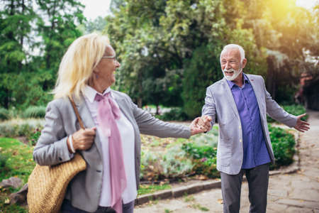 Happy to be with you. Beautiful elderly couple spending time together and smiling while walking outdoors. Family. Love concept
