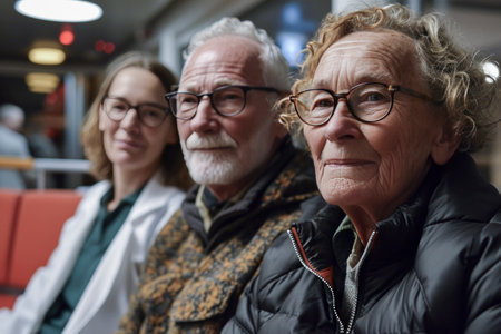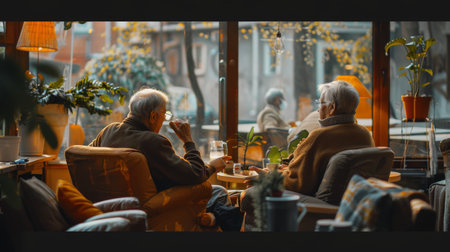 Seniors enjoying a lively conversation at a community center on a chilly afternoon in winter. Generative AI