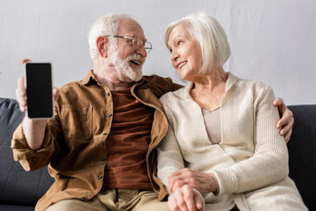 happy senior man showing smartphone with blank screen while looking at smiling wife