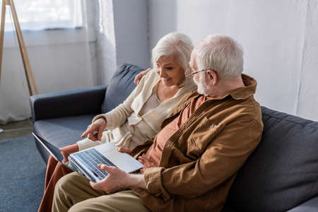 Pensive senior man sitting near wife with calculator and laptop on blurred foreground