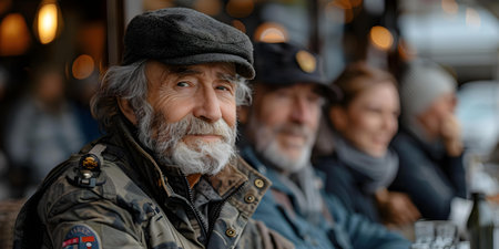 A diverse group of military veterans enjoying a sunny day at a street cafe sharing memories and camaraderie. Concept Veterans, Street Cafe, Sunny Day, Memories, Camaraderie