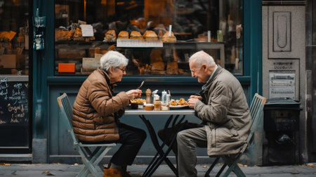Elderly couple eating a meal together at a small table outside a bakery, enjoying street food and each others company in a cozy urban setting