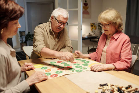 Senior man moving chip throughout paper board with green and red circles while playing leisure game with two mature women