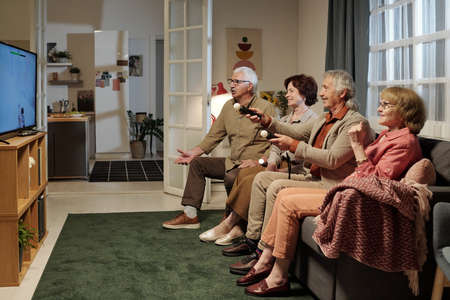 Group of happy grandparents in casualwear having talk about their interests while relaxing on soft comfortable couch in living room