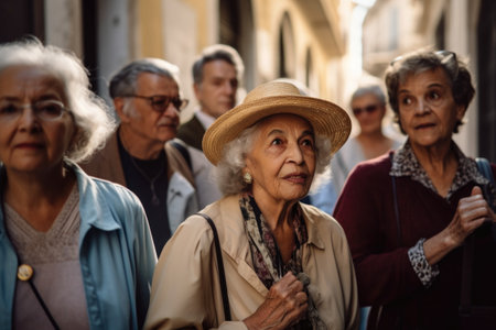portrait of a group of seniors standing together with their guide in the city, created with generative ai