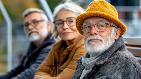 Four elderly people sitting side by side, wearing winter hats glasses portrait image, ai generated. Faces etched with lines of age picture photorealistic. Senior citizens concept photo realistic
