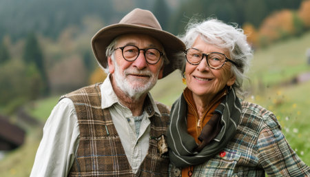 An elderly Asian couple enjoying outdoors, their love palpable, reflecting an Asian American immigrant's fulfilling retirement, fall or autumn atmosphere