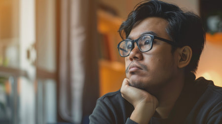 A man sits indoors, resting his chin on his hand, deep in thought with a serious expression during the golden hour.