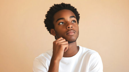 A young man thoughtfully gazes upward, lost in contemplation. His expression is serene and peaceful.