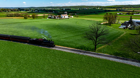 A vintage steam train chugs along a winding track, surrounded by vibrant green fields and rustic farmhouses. The sun shines brightly, highlighting the picturesque rural landscape.