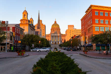 Afternoon light hits the buildings and downtown city center area in Pennsylvania state capital at Harrisburg