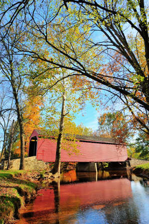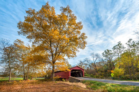 Old rustic bucolic covered bridge in the Maryland countryside during Autumn