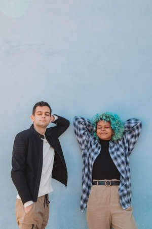 Enjoying autumn style Beautiful young couple bonding to each other and looking away while leaning at the grey wall with fallen leaves laying around them : Generative AI