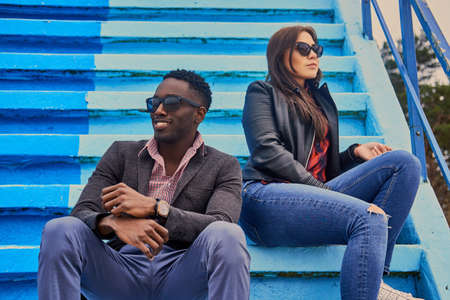 Stylish Black male and Caucasian female in sunglasses posing on a blue steps.