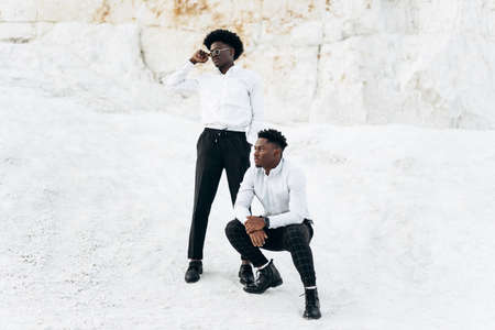 Two fashionable elegant black Africans, in white shirts, posing in full growth, outdoors near mountains and rocks, fashion posing with a beautiful landscape on the background, Fashion posing concept,